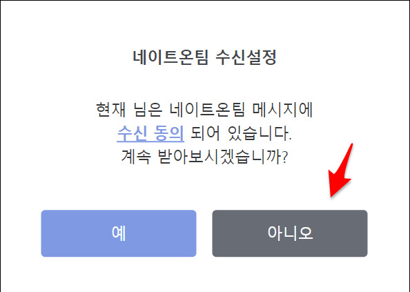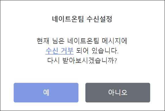 ● 3. 수신거부가 되면 아래처럼 수신 거부가 되었다는 메세지를 확인 가능합니다. 다시 메세지를 받고 싶다면 예를 클릭하시면 됩니다.