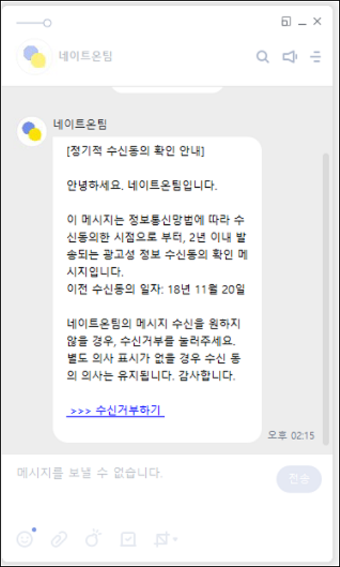 ● 2. 하지만 해당 메세지를 모르는 분은 아래 URL를 접속하면 아래처럼 네이트온팀 수신 설정을 거부할 수 있는 기능이 있습니다. 해당 버튼에서 수신동의를 거부하시면 됩니다.