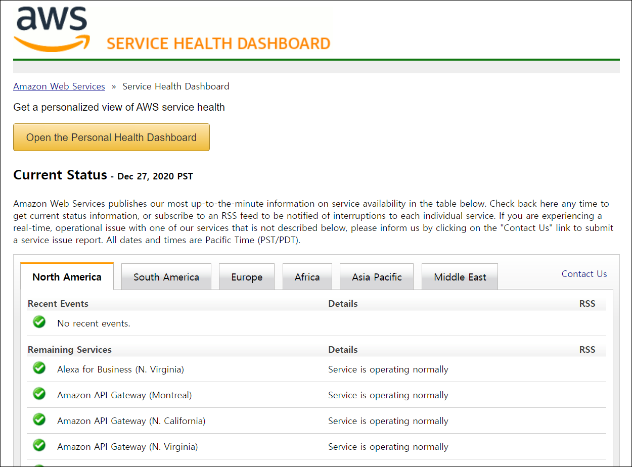 ● 1. AWS를 사용하는 IT 회사가 많습니다. 클라우드 서비스는 물리적인 서버를 신경 쓸 필요가 없고, 또 세계적인 IT 기업 maga의 일원인 아마존의 기술을 사용할 수 있는 장점이 있지만 여기도 사람이 운영하는 곳이라 가끔씩 오류가 납니다. 서버가 오류가 났을 때 아마존 서버가 현재 정상적으로 작동하는지 확인해보시는 것도 하나의 오류를 체크하는 방법입니다.