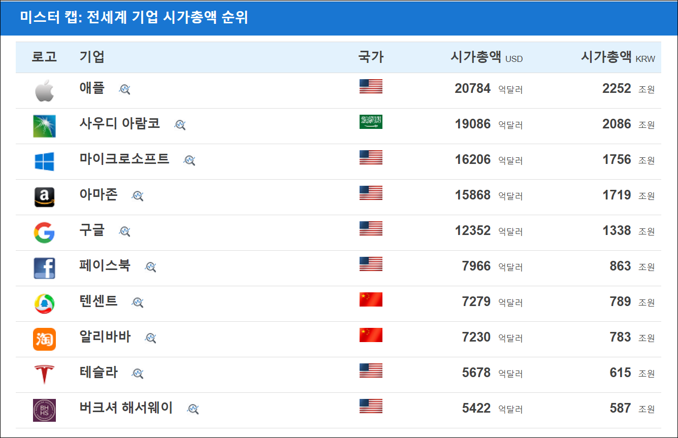 ● 2. 해당 사이트에 들어가면 1위부터 10위까지의 시가총액 순위대로 순위를 보여줍니다. 현재 1위는 애플입니다. 그리고 2위는 사우디아라비아의 아람코입니다. 그리고 MS, 아마존, 구글, 페이스북 IT 회사들이 모두 자리를 차지했습니다.