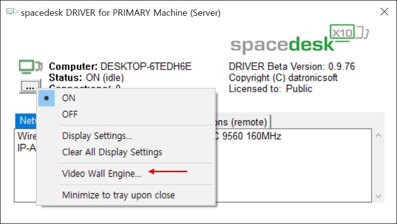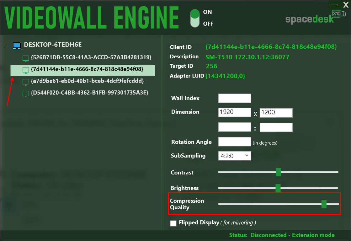 ● 2. 그럼 VIDEOWALL ENGINE이 실행됩니다. 왼쪽에서는 현재 모니터로 사용하는 태블릿을 클릭합니다. 그리고 오른쪽 하화면에서 "Compression Quality"를 조절합니다.
