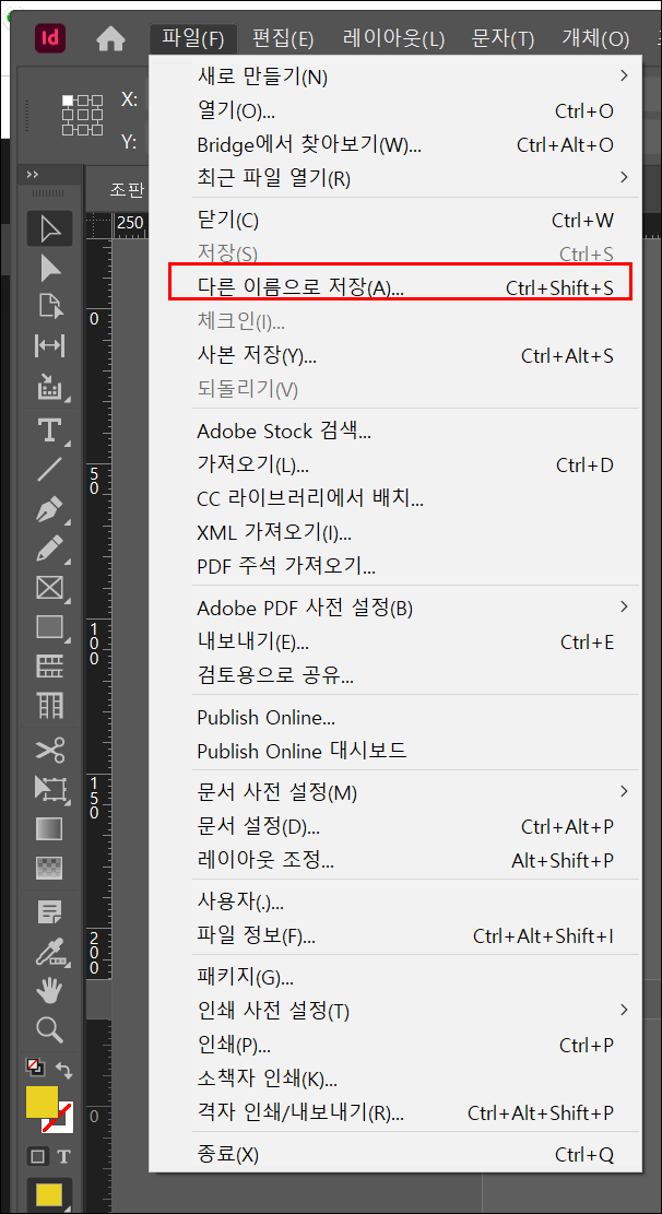● 2. 이 경우에는 최신 인디자인에서 저장할시에 IDML로 저장을 하면 쉽게 해결 됩니다. 파일에서 "다른 이름으로 저장(A)"을 클릭합니다.