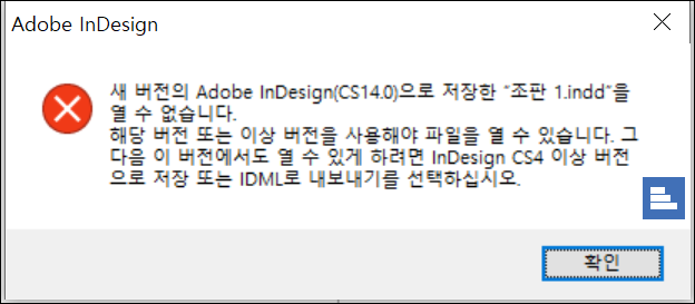 "해당 버전 또는 이상 버전을 사용해야 파일을 열 수 있습니다. 그 다음 이 버전에서도 열 수 있게 하려면 InDesign CS4 이상 버전으로 저장 또는 IDML로 내보내기를 선택하십시오"