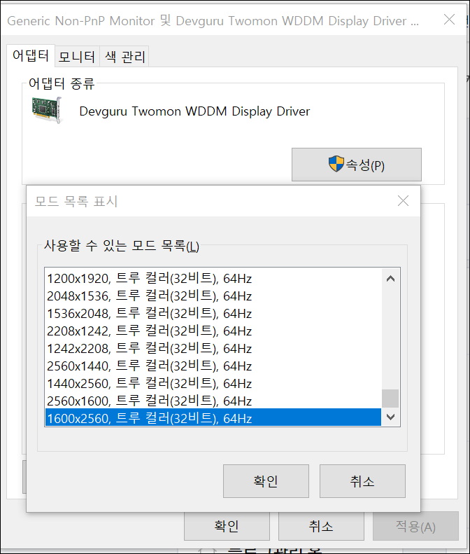 ● 3. 그런데 투몬 디스플레이 드라이버에는 최대 해상도가 1600x2560입니다. 즉 그 이상의 해상도는 출력하지 못합니다.