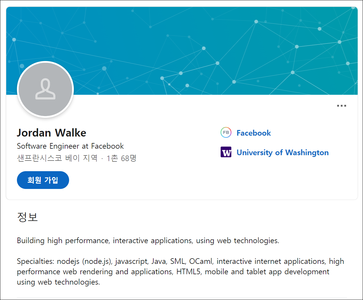 ● 3. Jordan Walke의 깃허브와 링크드인도 한번 둘러보세요. 존재감이 확실합니다.