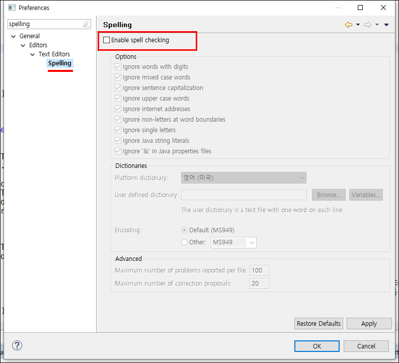 ● 3. 이럴 경우에는 환경설정에 들어가서 spelling이라고 검색을 합니다. 그리고 나타나는 메뉴를 클릭하고 "Enable spell checking"을 체크 해제합니다.