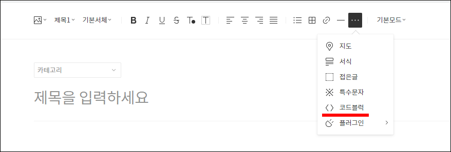 ● 5. 그리고 새로운 글쓰기 모드로 접근합니다. 그 다음 ...으로 되어 있는 아이콘을 클릭하여 "코드블럭"을 실행합니다.
