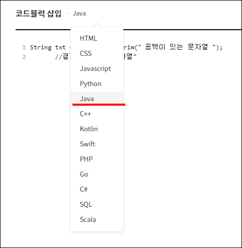 ● 6. 그럼 코드블럭을 삽입할 수 있는 창이 뜹니다. 첫번째로는 삽입할 언어의 종류를 선택합니다. 그리고 소스를 넣고 적용을 누르면
