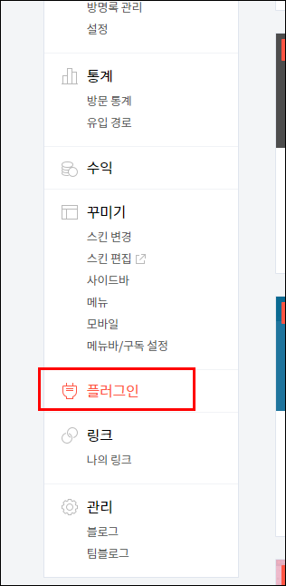 ● 2. 티스토리 관리자로 로그인 한다음 플러그인으로 이동합니다.