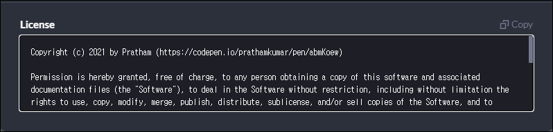 ● 2. 다시 말씀 드리면 이용은 할 수 있지만 라이센스를 꼭 명시해야 합니다. 라이센스는 펜에서 자동으로 MIT 형식으로 기록되어 있습니다. 이를 카피하여서 사용하고 싶은 홈페이지에 명시하시면 됩니다.