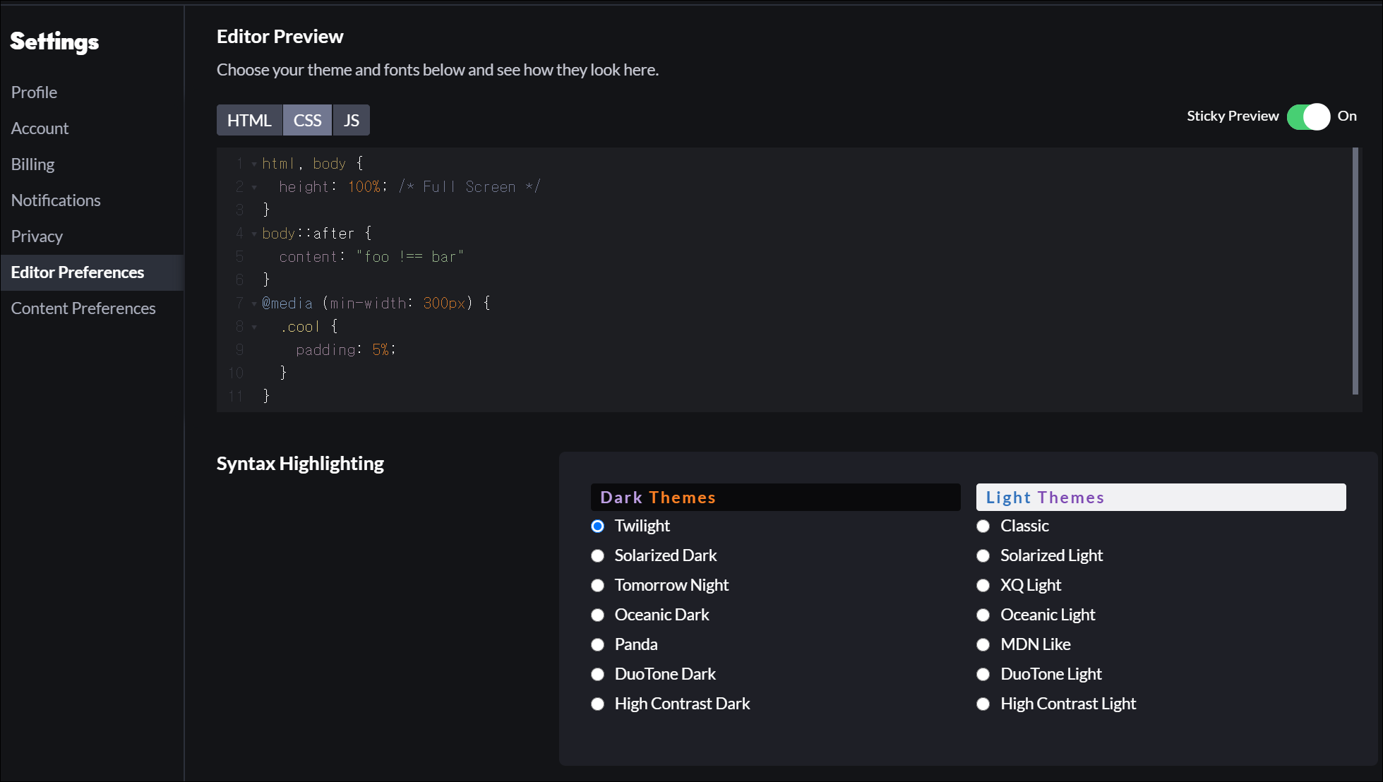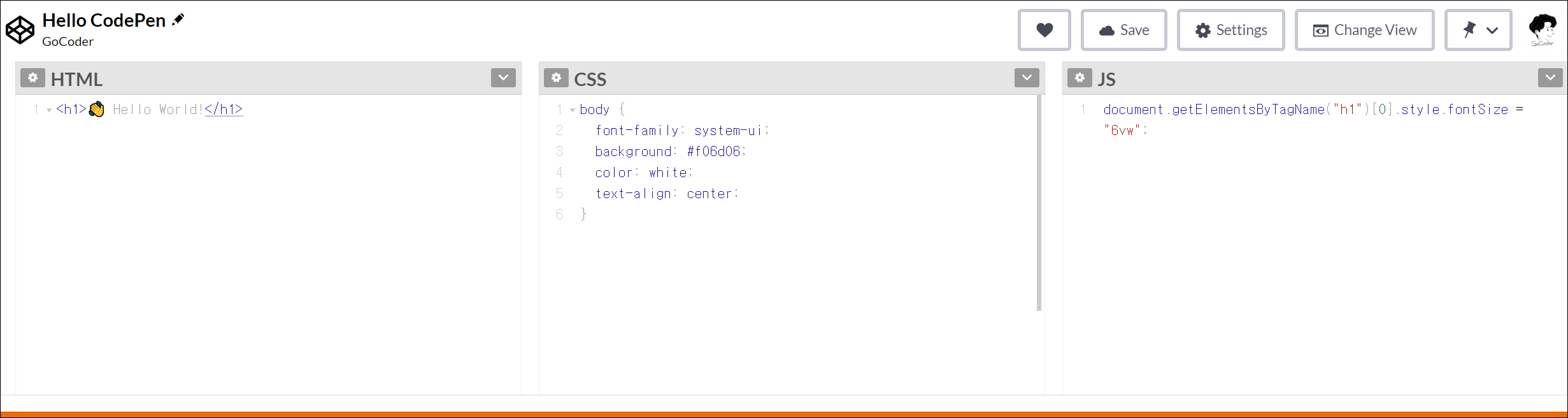 ● 1. 코드펜은 기본적으로 다크 테마가 기본입니다. 익숙하기도 합니다. 하지만 간혹 어두운 테마를 싫어하는 개발자도 있고, 우리의 눈은 흰 바탕에 검은 글자가 가장 이상적이라는 글을 본 기억도 있습니다. 사람마다 성향이 다르므로 코드 펜에서는 여러 가지 테마를 준비해놓았습니다. 이번 시간에는 좀 밝은 버전으로 에디터 창을 변경해보겠습니다.