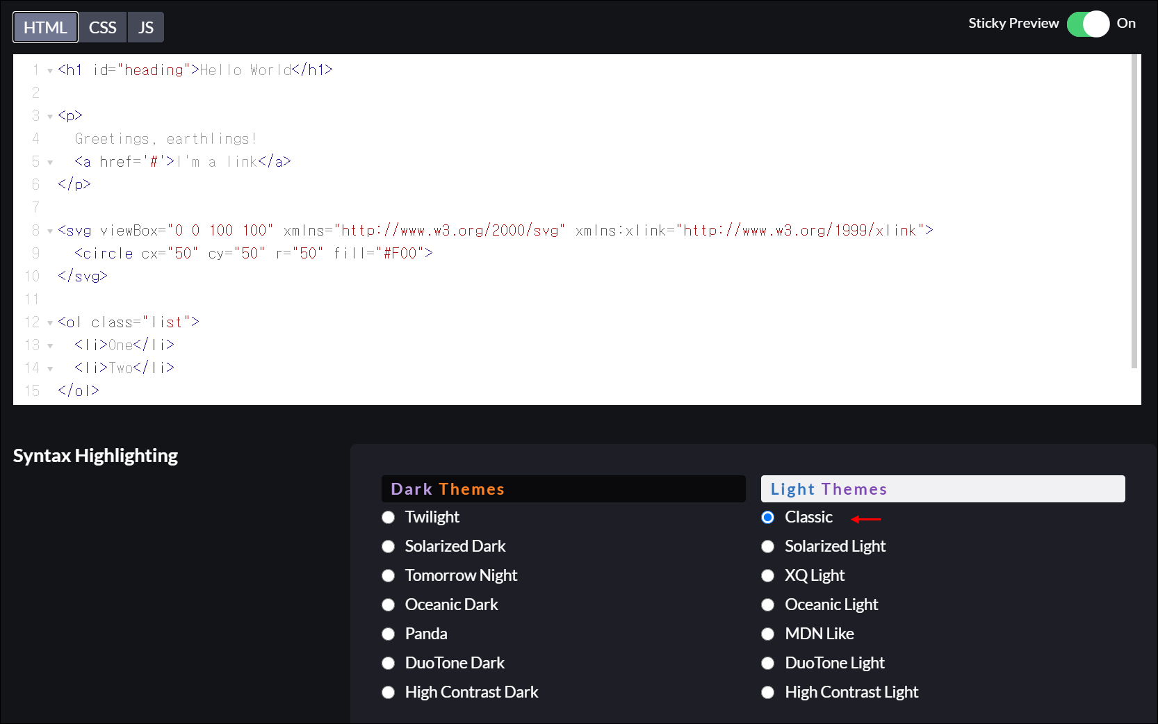 ● 4. 여기서 "Light Themes"에서 "Classic"을 클릭하면 즉시 변경이 완료되고 상단에는 보일 예시가 나타납니다. Save 버튼은 따로 없습니다. 이제 에디터 창으로 이동합니다.