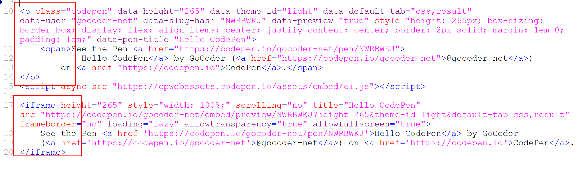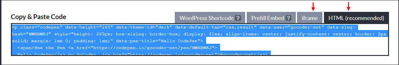 ● 5. 소스를 확인해보면 HTML 모드는 P태그로 페이지에서 작동되도록 되어 있고, iframe 모드는 코드펜의 페이지를 노출하는 방식으로 되어 있습니다.