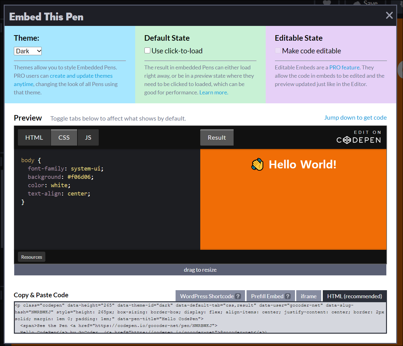 코드펜 에디터 다른 곳에서 보여주기