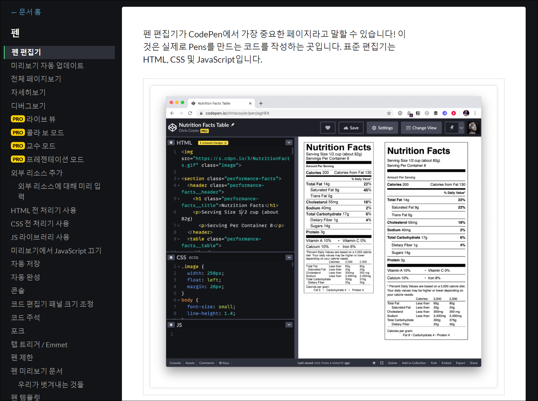 ● 3. 그럼 한글로 자연스럽게 번역된 코드펜 매뉴얼을 확인할 수 있습니다. 조금 어색한 부분도 있지만 충분히 이해 가능한 수준입니다.