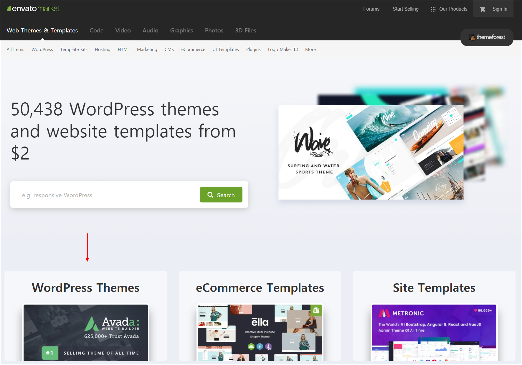 ● 2. 해당 사이트의 주소로 접속을 합니다. 그럼 아래와 같은 사이트가 나타납니다. 이 사이트는 워드프레스부터 사이트 템플릿까지 다양한 스킨들을 판매하고 있습니다. 해당 메뉴에서 "WordPress Themes"를 클릭합니다.