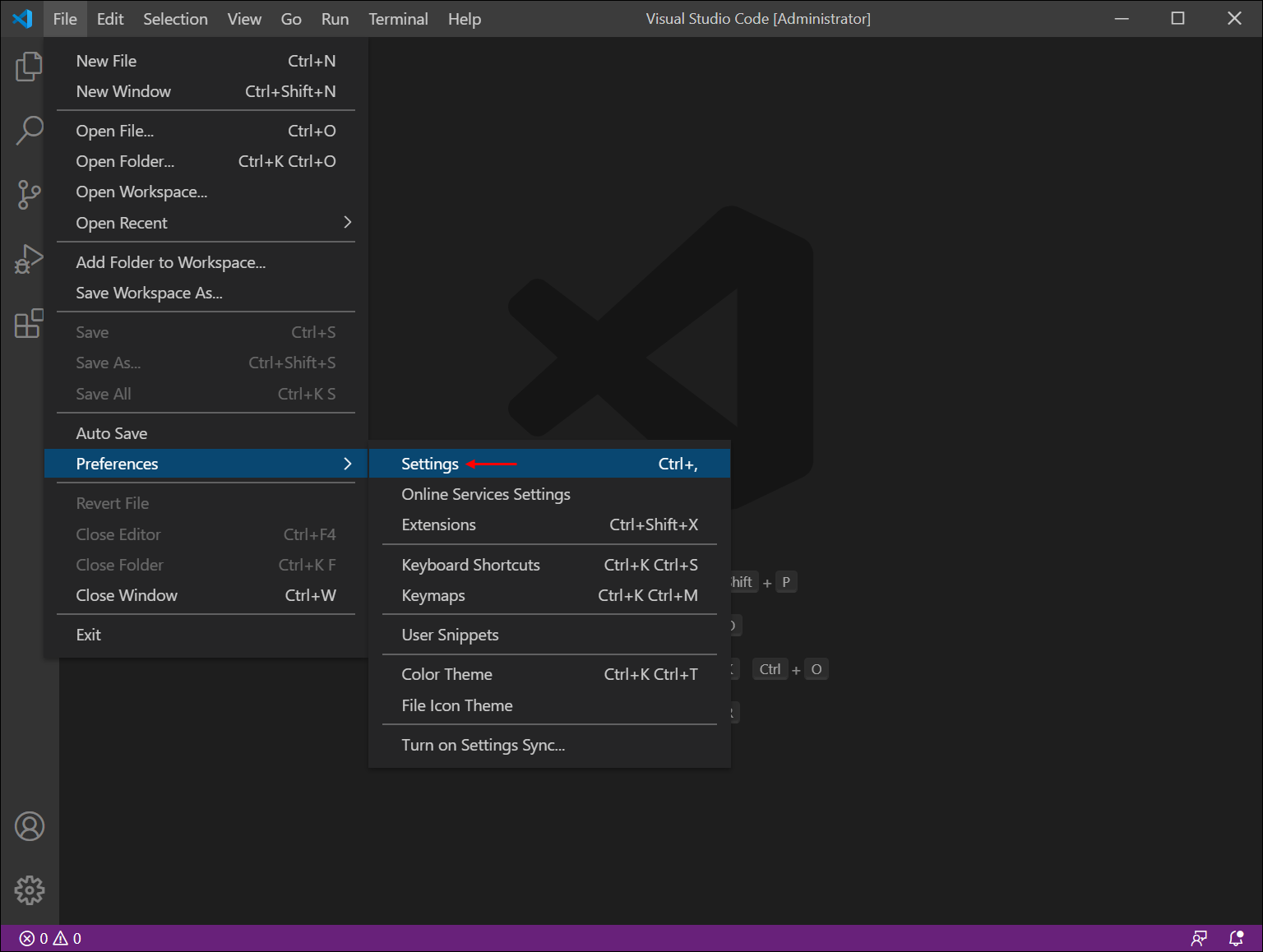 ● 2. 비주얼 스튜디오 코드를 실행하고 File > Preferences > Settings를 클릭합니다. 단축키 Ctrl + , 을 누르면 더 쉽게 접근이 가능합니다.