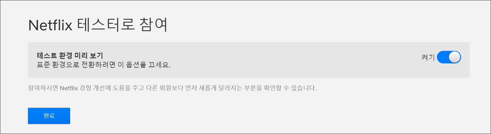 ● 2. 자신의 넷플리스 아이디로 로그인을 한 다음 아래로 접속을 합니다. 그럼 테스트 환경 미리 보기라는 이름이 있고 이를 켜기로 상태 값을 만드면 됩니다. 이 기능을 실행한다고 천지가 개벽하는 기능들이 오픈되는 건 아닙니다. 문제가 생길 때만 끄기를 해도 상관없습니다.