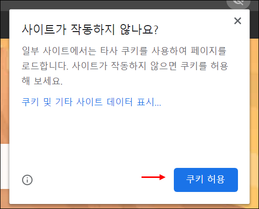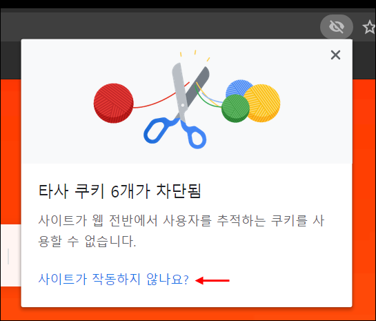 ● 2. 이를 클릭하면 이런 창이 나타납니다. 쿠키를 허용하기 위해서는 "사이트가 작동하지 않나요?"를 클릭합니다.