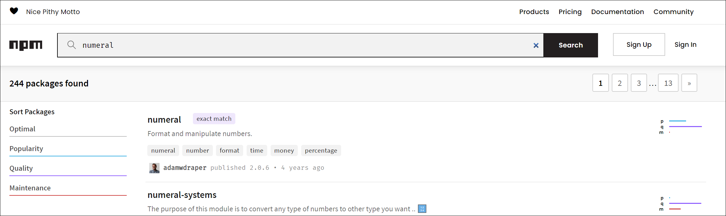 ● 3. 자신이 사용하고 싶은 npm을 검색하면 연관 패키지까지 모두 검색됩니다. 그리고 리스트에서는 평점, 품질, 유지보수 3개의 점수를 매겨서 관리하고 있습니다. 신뢰할 수 있는 패키지가 어떤 것인지 파악이 가능합니다.