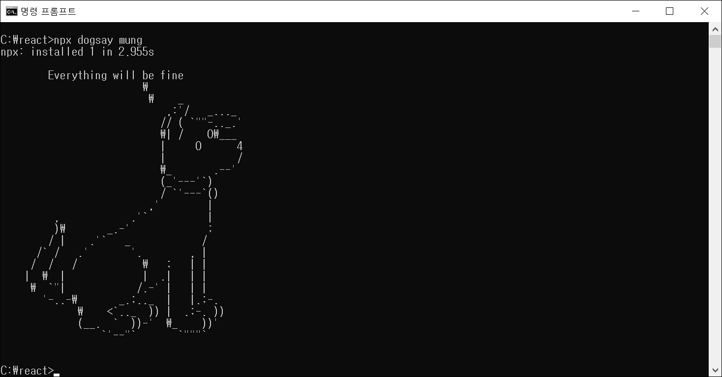 ● 3. 한번 npx를 실습해보겠습니다. 최신 버전의 Node와 npm이 설치되어 있다는 조건하에 아래 명령어를 한번 실행해보세요. 그러면 해당 패키지를 설치를 하고 실행합니다. 그리고 어떤 설치도 이루어지지 않았습니다.