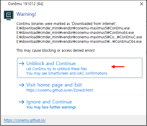● 1. cmder을 처음 실행하면 아래와 같은 경고창이 나타납니다.