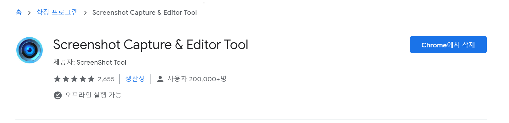 ● 2. 하지만 상업적인 용도가 아닌 선에서 사용하고 싶을 때 스크린샷 이미지가 필요할 때가 있습니다. 이때에는 방법이 있습니다. 크롬을 통한 확장 프로그램으로 캡처를 하면 화면에 영상을 이미지로 담을 수 있게 됩니다. 제가 사용하는 프로그램의 이름은 "Screenshot Capture & Editor Tool"입니다. 이를 설치합니다.