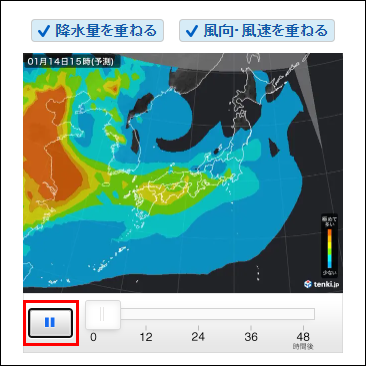 ● 3. 아랫부분에 플레이 버튼을 누르면 48시간 동안 미세먼지가 흘러갈 흐름이 보입니다. 한국도 지도상에 표시됩니다.