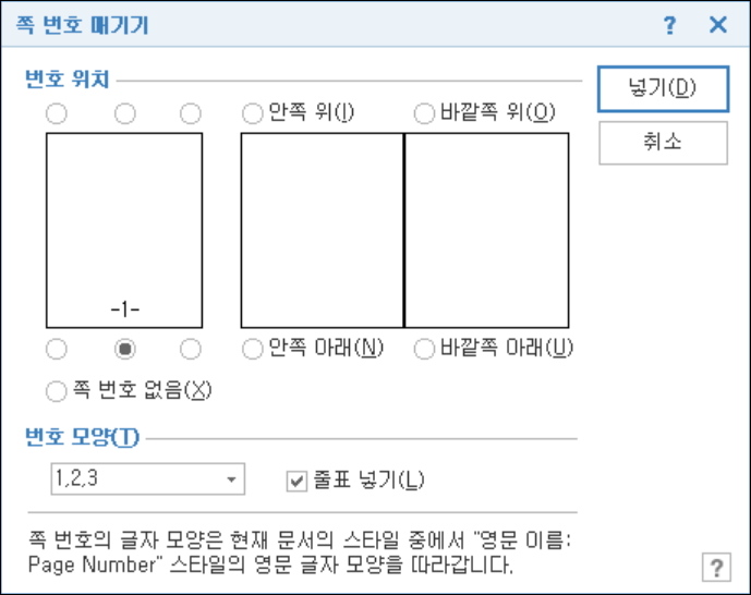 ● 3. 그럼 이런 옵션이 나타납니다. 쪽번호를 어떻게 매길 것인지 구체적인 설정이 가능합니다. 만약 기본 설정이라면 페이지마 맨 아래 가운데 "-1-" 이런 식으로 쪽번호가 매겨집니다. 선택을 완료했다면 넣기(D)를 클릭합니다.