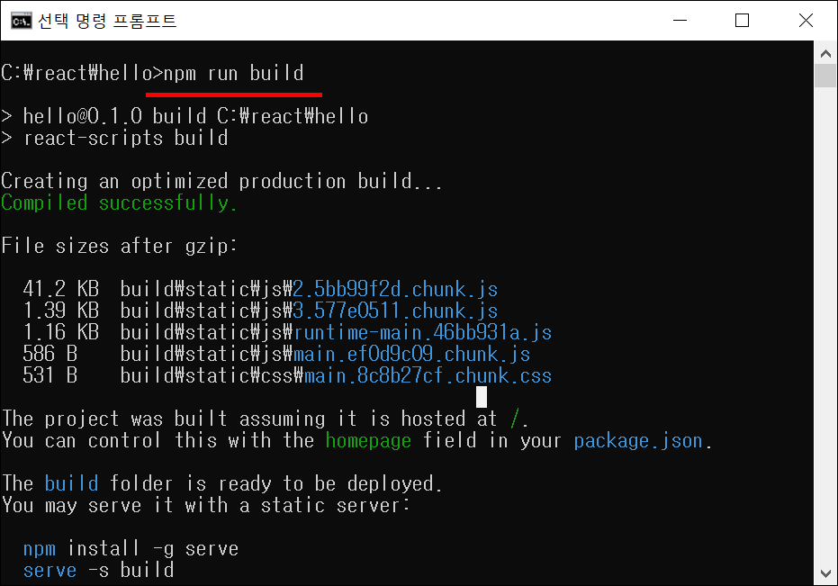 ● 2. 명령 프롬프트로 우리가 만들어놓은 리액트의 폴더로 이동합니다. 그리고 아래와 같은 명령어를 실행합니다. 그럼 알아서 빌드가 진행되고 배포 버전으로 파일들이 만들어집니다.