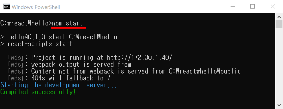 ● 2. 빌드된 프로젝트를 명령 프롬프트로 이동합니다. 제 블로그와 공부 중이라면 C:\react\hello 폴더에서 실습 중입니다. 해당 폴더에서 아래 명령어를 실행합니다. 프로젝트를 실행하는 npm 명령어입니다. 그럼 자동으로 localhost:3000로 기본 브라우저가 열리면서 결과 값이 보입니다.