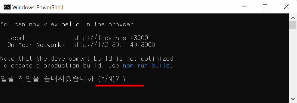 ● 4. 방법은 간단합니다. 바로 단축키 Ctrl + C를 입력합니다. 혹시 나타나지 않으면 여러분 단축키를 누르면 아래처럼 일관 작업을 끝내시겠습니까?라는 메시지 창이 나타납니다. 여기서 "Y"를 입력하면 서버가 중단됩니다.