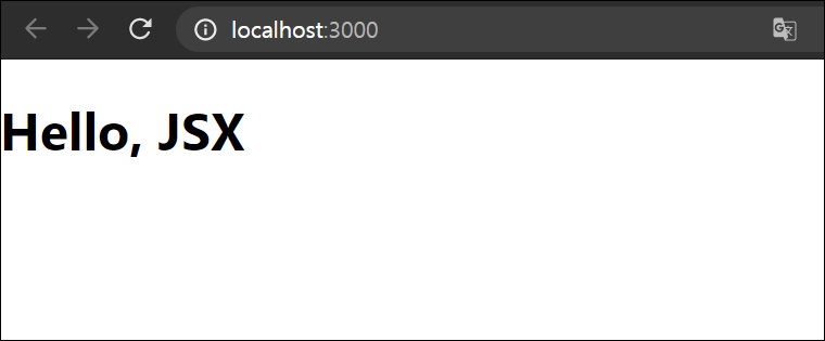 ● 4. 내용이 수정되었다면 이제 프로젝트를 실행합니다. 그럼 아래처럼 Hello JSX가 출력됩니다. element에 입력한 내용이 자연스럽게 페이지에 노출되었습니다. 순식간에 헬로 코딩이 끝나 버렸네요.