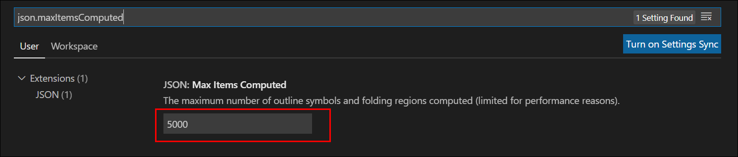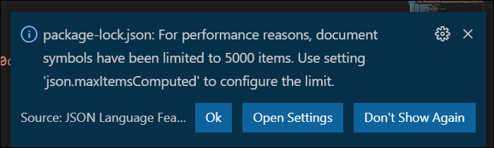 " package-lock.json: For performance reasons, document symbols have been limited to 5000 items. Use setting 'json.maxItemsComputed' to configure the limit. "