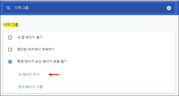 ● 3. 구글 환경 설정에서 "시작 그룹"이라고 검색을 합니다. 그럼 시작 그룹이 나옵니다. 여기서 "특정 페이지 또는 페이지 모음 열기"를 클릭하고 페이지 추가를 클릭합니다.