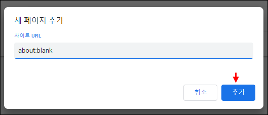 ● 4. 그다음 사이트 URL 칸에 "about:blank"를 입력합니다. 이는 빈 페이지를 나타냅니다. 그리고 추가를 합니다.