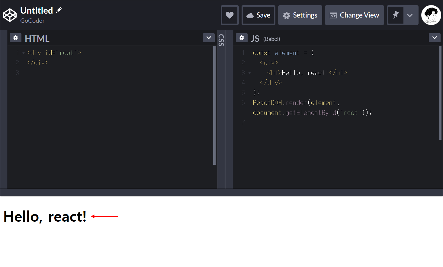● 7. 아래처럼 코드펜에서 코드를 작성해보았습니다. 아주 간단하게 리액트 문법을 사용해 "Hello, React"를 실행하였습니다. 따로 플레이버튼이 있는게 아니라 코드 입력시 자동으로 실시간으로 라이브 뷰로 노출이 됩니다.