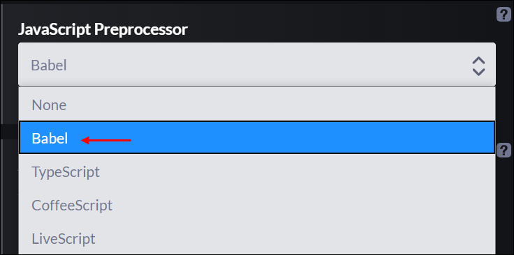 ● 6. 다음은 상단 화면에서 JavaScript Preprocessor에서 babel을 선택합니다.