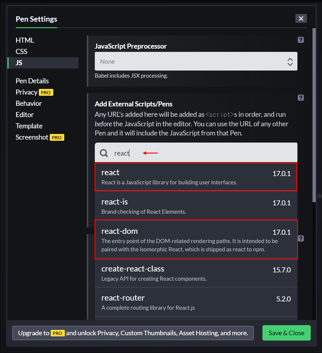 ● 4. 왼쪽 탭에 JS를 클릭합니다. 자바스크립트 설정을 할 수 있는 화면이 오른쪽에 나타납니다. 그리고 "Add External Scripts/Pens" 에서 react를 검색합니다. 나타나는 아이템에서 "react"와 "react-dom"을 클릭합니다.