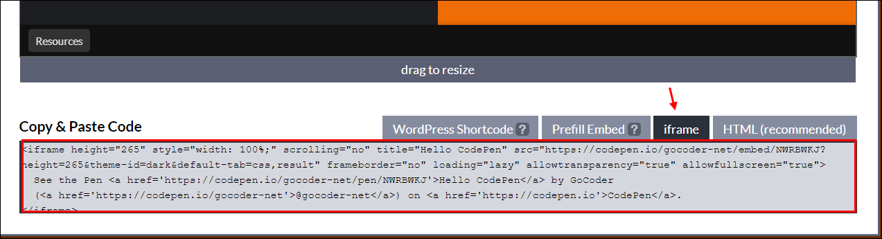 ● 3. "Copy & Paste Code"에서 iframe를 선택하고 소스를 복사합니다.