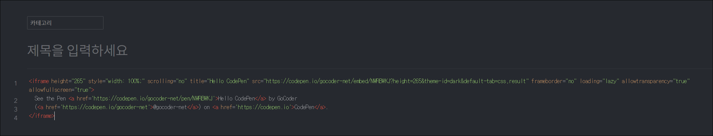 ● 5. 그리고 코드펜에서 복사해온 소스를 그대로 붙여 넣습니다. 그럼 이런 형태로 iframe으로 시작하고 끝나는 코드가 입력됩니다.