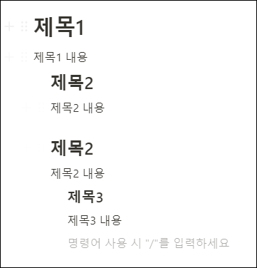 제목은 HTML에서 "제목 태그"로 사용하는 그 개념과 같습니다. 해당 콘텐츠에 대한 대제목, 중제목, 소제목을 표현할 수 있습니다. HTML에서는 1부터 6까지의 제목을 지원하지만 현재 노션에서는 h1, h2, h3 이 3가지의 제목만을 사용 중입니다.