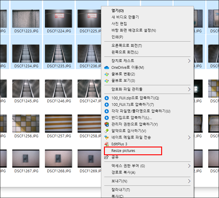 ● 4. 설치가 완료되면 이미지를 한꺼번에 선택 후에 마우스 우클릭에서 "Resize pictures"를 클릭합니다.
