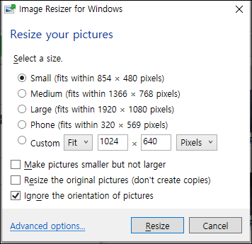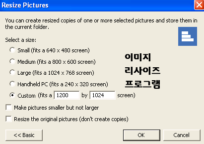 ● 5. 그리고 나타나는 팝업창에서 원하는 사이즈를 선택 후에 Resize를 클릭합니다.