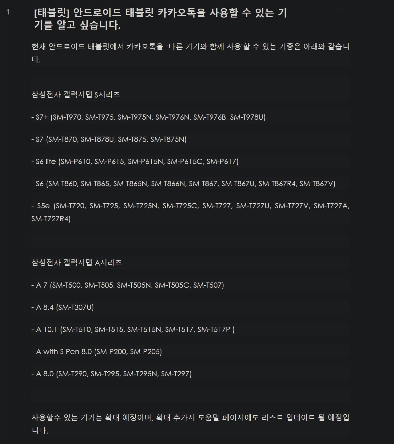 ● 2. 해당 카카오톡 CS 사이트에서는 공식적으로 카카오톡이 사용 가능한 안드로이드 태블릿 리스트를 확인할 수 있습니다. 현재 리스트는 아래와 같습니다.