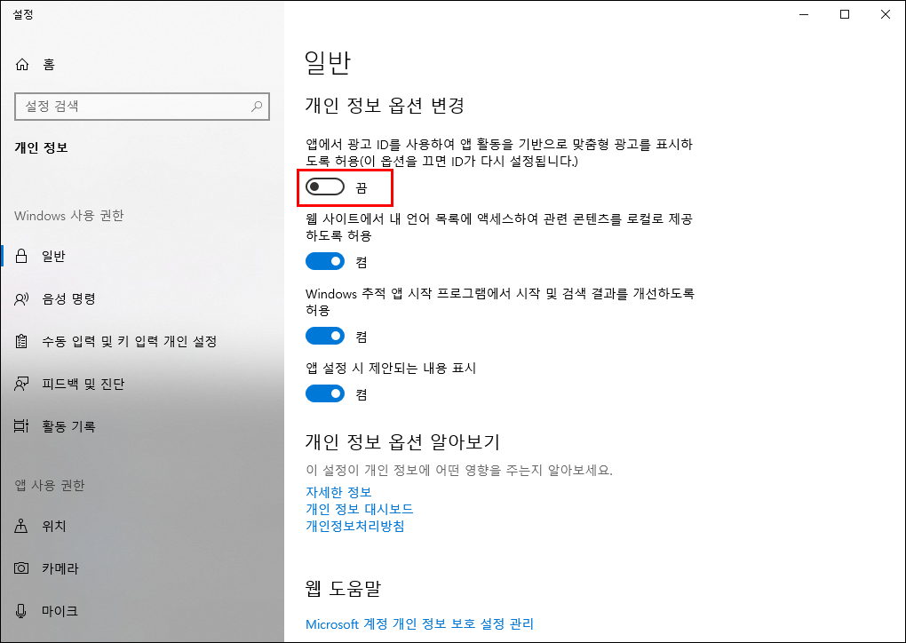 ● 3. 그리고 "앱에서 광고 ID를 사용하여 앱 활동을 기반으로 맞춤형 광고를 표시하도록 허용"을 끔으로 설정합니다.