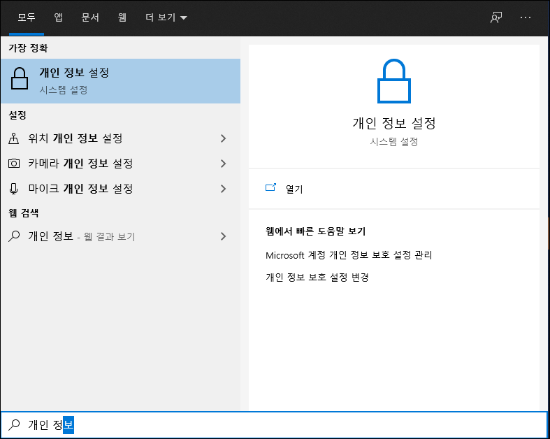 ● 2. 시작 버튼을 누르고 "개인 정보 설정"을 검색합니다. 자물쇠 모양의 아이콘입니다.