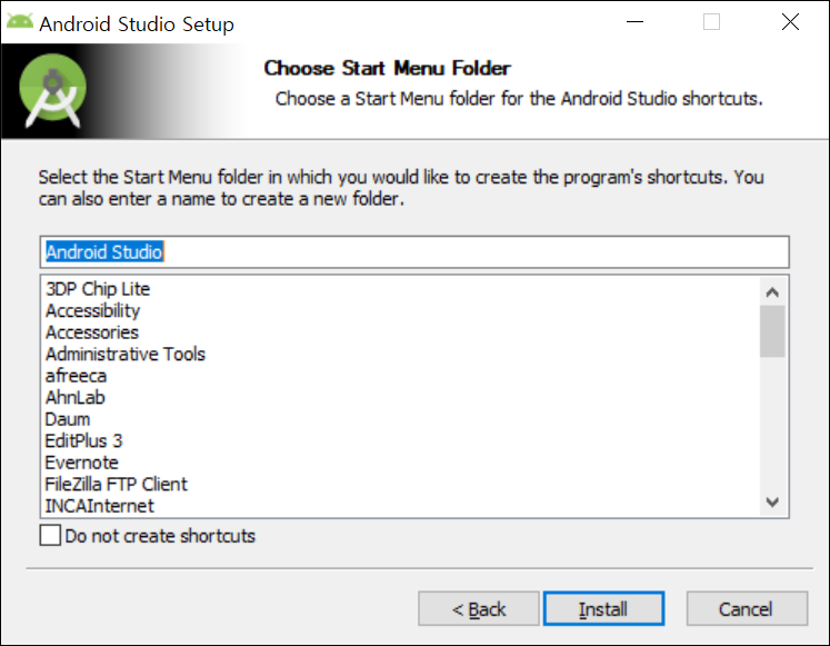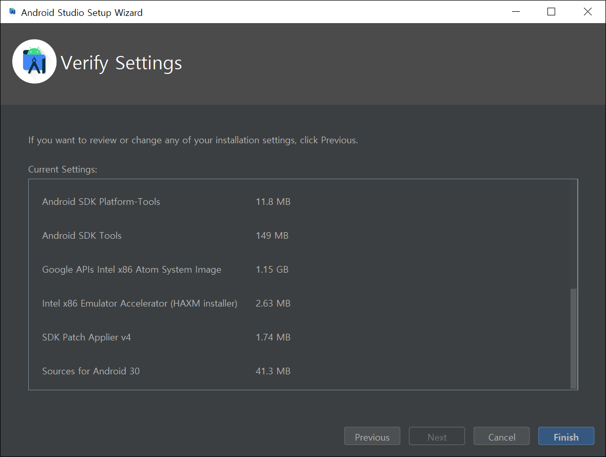 ● 6. 설치할 내역들을 확인합니다. "Android Virtual Device"는 체크되어 있는 채로 설치합니다. 꼭 필요한 항목입니다.!