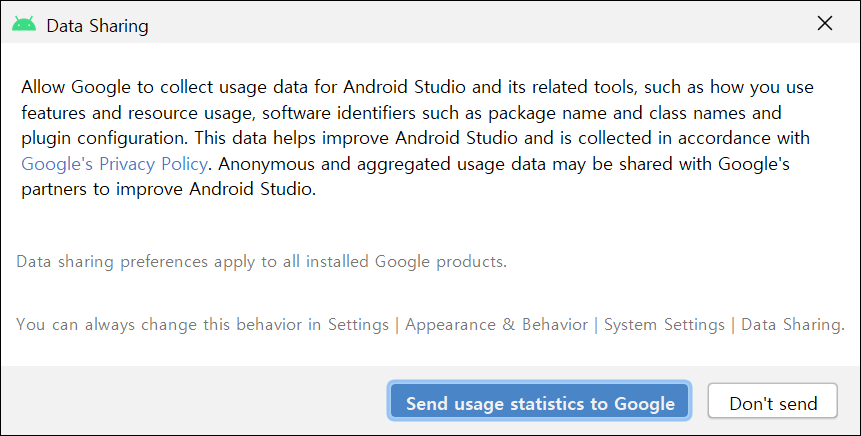 ● 13. 이 부분은 통계를 구글로 보내는 부분입니다. 저는 보내지 않기를 설정하겠습니다. "Don't send"