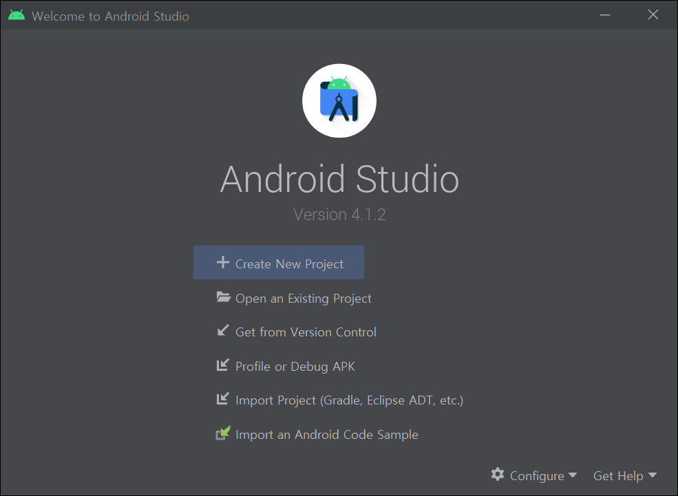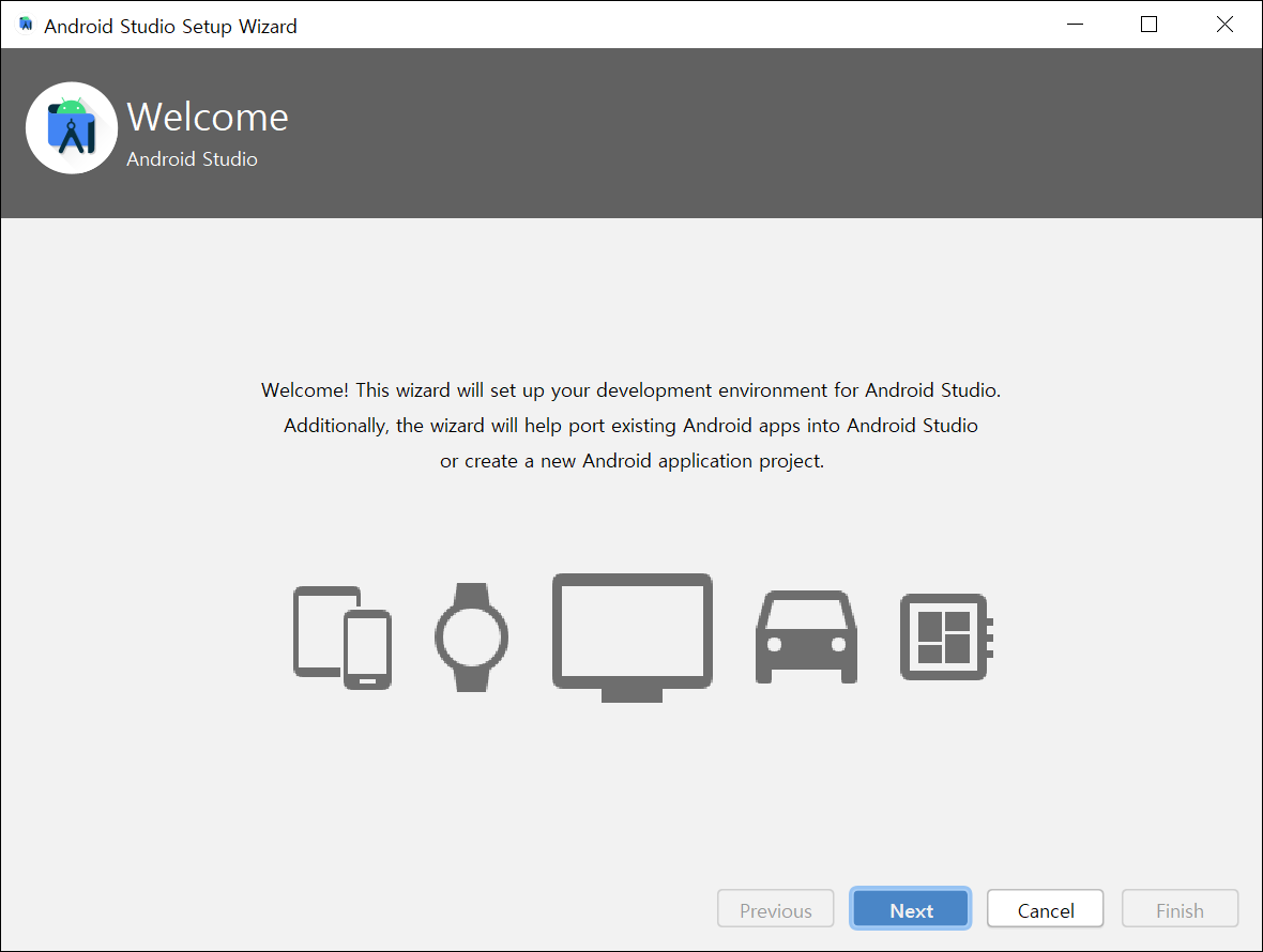 ● 20. 안드로이드 스튜디오 시작 화면이 나타납니다. 이것으로 프로그램 설치가 완료되었습니다.